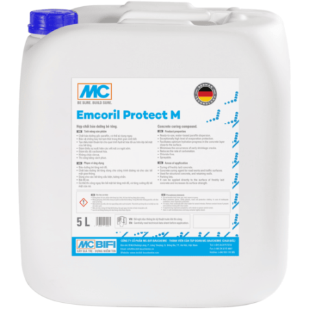 – Đối với bề mặt thẳng đứng: Sau khi tháo bỏ ván khuôn, làm ẩm đều toàn bộ bê tông bằng nước sạch. Để cho bề mặt bê tông ráo nước trước khi thi công Emcoril Protect M bằng thiết bị phun hay bằng chổi (nên thi công bằng phương pháp phun để phủ kín hoàn toàn bề mặt). Chú ý toàn bộ bề mặt phải được phủ hoàn toàn.