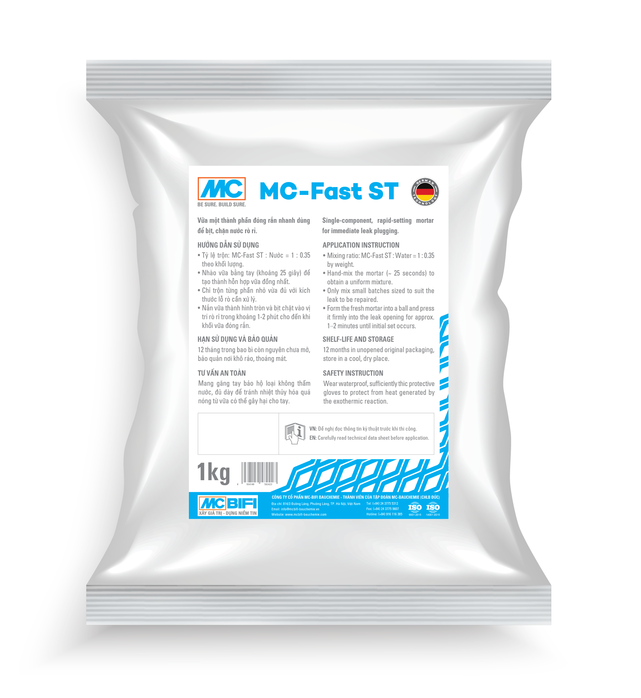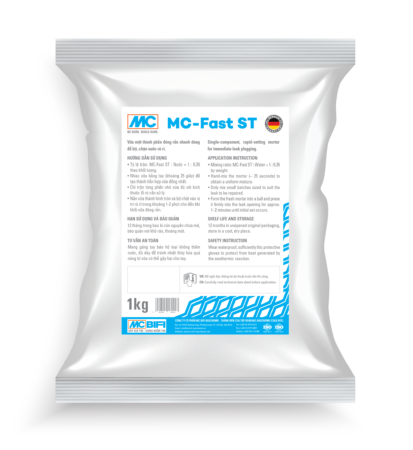 ➢ MC-Fast ST (hay MC-Fix ST) là vữa một thành phần đóng rắn siêu nhanh, được dùng để bịt, chặn nước rò rỉ hoặc nước chảy trên bê tông và vữa xây chỉ trong vài phút. Sản phẩm cho phép thực hiện công tác sửa chữa tức thời và tạm thời các vết rò rỉ nước không mong muốn.